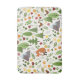 Scandinavian folk art style nature illustrations (woodland; fox, leaves, trees, flowers, mountains and birds) in a surface pattern design on a light cream colour background.