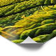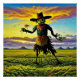 A.I .created print of a scarecrow dressed in a suit stands in the middle of lush vegetable fields under a vibrant sunset. The landscape stretches into the distance with rows of crops and a colourful sky filled with clouds