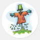 Don’t be scared it is just a scarecrow. They are designed to scare the birds away. This scarecrow has an orange top on and appears to be wearing a bucket on its head. It’s arms are outstretched and is is standing in some green grass. This scarecrow design looks great on these stickers. Perfect for yourself or as a gift