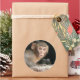 Round sticker of a scared monkey with big eyes looking like it is frightened by something or like it suddenly remembers something.