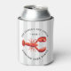 Personalised Scarlett Red Lobster-themed food can coolers for your next Lobster Bake Party or seafood event. It features a watercolor-styled illustration of a bright red lobster. Surrounding this are spots for your unique event information.