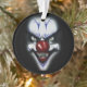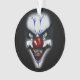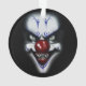 A very scary evil clown with blue decorations on his face and sharp teeth.