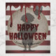 These spooky custom Halloween wine bottle labels labels feature a creepy carnival theme. A shadow of a scary clown holding a balloon is printed across the centre. A vintage style, circle parchment paper carnival poster is featured in the background, over a red and white striped pattern. Blood is dripping across the top portion. The greeting "Happy Halloween" is printed across the top in a blood red, sinister font. A sample family name is printed above the clowns, which you can personalise to include your own custom name or text.