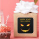 Scary eyes and crazy smile in yellow and orange on black background. Perfect sticker for any gift at Halloween time.