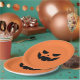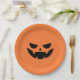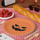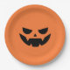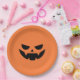 Spooky chic plates for your Halloween party feature a scary jack o lantern face on an orange pumpkin background.