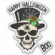 Sticker with orange rose, Skull and Spider and text, "Happy Halloween."