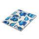 Ceramic tile in a print of scattered pears and leaves, adapted from vintage botanical art, digitally enhanced and coloured, in deep indigo and shades of denim blue on white