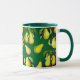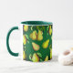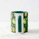 Coffee mug in a print of scattered pears and leaves, adapted from vintage botanical art, on a deep emerald green background