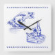 A delightful toile-inspired clock in blue willow colours featuring playful kitty cats romping in a bathroom.