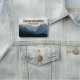 Name tag with a photograph of beautiful mountains, cloudy sky, and rolling hills filled with trees in the foreground. Grey blue colour scheme.