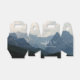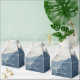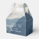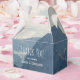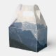 Small favour box with a photograph of beautiful mountains, cloudy sky, and rolling hills filled with trees in the foreground. Grey blue colour scheme.