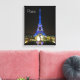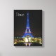 A scenic view from Paris, France. The famous landmark, the eiffel tower, seen at night lit up by bright blue lights.