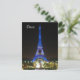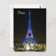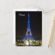 A scenic view from Paris, France. The famous landmark, the Eiffel Tower, seen at night lit up by bright blue lights.