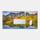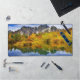 Desk mat with a beautiful country photograph. Mountains of stone with an autumn forest in bright colours. A quiet lake reflects the mountains, trees and grasses.