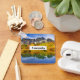 A keychain with a beautiful country photograph. Mountains of stone with an autumn forest in bright colours. A quiet lake reflects the mountains, trees and grasses.