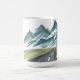 Start your day with a sip of adventure! This beautiful coffee mug features a stunning watercolor painting of a winding road leading into a majestic mountain range. The artistic, painterly style with its soothing palette of deep teals, earthy greens, and charcoal greys captures the serene feeling of the open road.