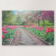 Scenic Spring themed photograph features a garden path lined with beautiful pink tulips with pink, green and white flowering trees in the distant.