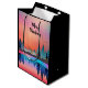 A gift bag with a beautiful graphic design featuring a peaceful lake with deer. and tall pine trees being reflected in the water. Stars hover overhead.