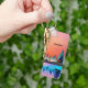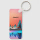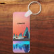 A key chain with a beautiful graphic design featuring a peaceful lake with deer. and tall pine trees being reflected in the water. Stars hover overhead.