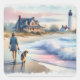 This dreamy coastal artwork captures a tranquil moment at the shoreline, where a woman strolls barefoot with her dog, the soft pastel tones of the setting sun casting a warm glow on the sand and sea. A charming beach house sits nestled among windswept grasses, its porch inviting and timeless, while a stately lighthouse watches over the horizon. Gentle waves roll in with watercolor softness, and hints of blush pink, misty blue, and sun-kissed gold give the scene an ethereal, nostalgic quality. The entire composition evokes slow living, serenity, and the quiet magic of coastal escapes. With a relaxed, coastal cottagecore vibe and a soft, painterly style, this piece blends warmth and whimsy in perfect harmony. AI generated artwork.