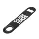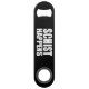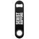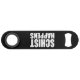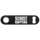 This black geology-themed bottle opener features the classic, corny phrase "Schist Happens," a pun variation on another common saying. The design is in bold, white block letters on a black background.