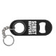 This black geology-themed bottle opener features the classic, corny phrase "Schist Happens," a pun variation on another common saying. The design is in bold, white block letters on a black background.
