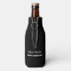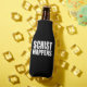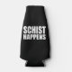 This geology-themed bottle sleeve features the classic, corny phrase "Schist Happens," a pun variation on another common saying. The design is in bold, white block letters on a black background. There are two lines of text on the back, where you can add your own name or short message, so nobody will take your drink!