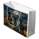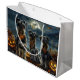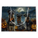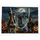 Unleash the spooky spirit with this eerie Halloween design featuring a pack of dogs under a dark, moonlit sky, surrounded by flying bats and glowing pumpkins. Perfect for those who love a touch of frightful fun with their furry friends!