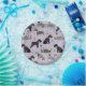 Cute Schnauzer dogs in black, salt and pepper and black and silver coats sit, stand and rollover with scattered dog bones and paw prints on a light purple background.