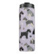 Cute Schnauzer dogs in black, salt and pepper and black and silver coats sit, stand and rollover with scattered dog bones and paw prints on a light purple background.