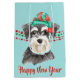 A cute Schnauzer dog wears a red and green Santa Claus hat in front of strings of red and green Christmas beads on both sides of this gift bag. At the bottom are text fields in matching red for your own text. Currently one side says "Merry Christmas" and the other side says "Happy New Year", but you may change them if you'd like. The images and text are placed on a lighter mint green background. Be sure to see the matching products in our store.