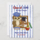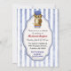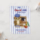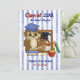 Delightful scholar Owl Graduation in Mortar cap sitting on some books beside a chalk board photo border. Light blue stripe background. Replace with your photo and customise the text areas on front and back.