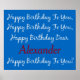 Send a song to the special birthday person. Bright blue background has the classic song in white and the name in bright red.