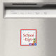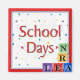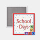 Fun and colourful design features multi coloured paint splatters and square alphabet blocks that spell Learn. Text says School Days in red. Blue and red border accent.
