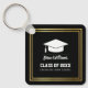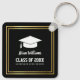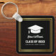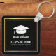 A black and white graduation design, personalised with the former student name, school and year... with the graphic image of a grad hat