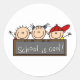 Three stick figure kids with big smiles and a school writing board that reads "School is Cool!" on back to school Tshirts, mugs, cards, stickers, buttons, and more that can be customised.