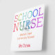 School Nurse Colourful Personalised Typography School Wall Clock. Watercolor texture rainbow letters spelling SCHOOL NURSE in red orange yellow green blue and purple. Personalise with name and school or delete text to remove information. Fun gift for your favourite school nurse to hang up at school in her office. Colourful and modern typography.