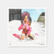 This design features a sad female cyborg in a sci fi pink outfit sitting on a bed of ice.