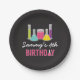 Girls science party dessert plate, perfect for your little scientists' next birthday experiment. Dark grey background with colourful beakers in green, pink, yellow, purple and teal.