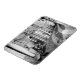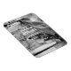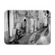 Rectangular photo magnet with a vintage scooter parked in front of a house in a cobblestone street in a city in Italy in stylish black and white.