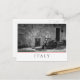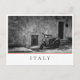 Photo postcard of a scooter in front of an old wall in a town in Italy in black and white with the text 'Italy' in a white box and with stripes in green, white and red, the colours of the Italian flag.