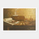 Still Life Serigraphy depicting cigars, score sheet, humidor, glass of liquor, cigar cutter and burning cigar in ash tray sitting on an old wooden table, contains the colours sienna, firebrick, old lace, maroon, blanched almond, saddlebrown, black. sandy brown, navy, bisque.