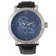 Watch featuring the zodiac symbol for Scorpio in soft silver blue, overlaid with the stars of the constellation, against a dark blue, starry sky background