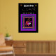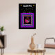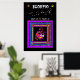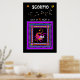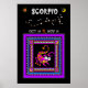 The scorpion is the graphic symbol of the birth sign, Scorpio. Those born between October 23 and November 21 are born under the constellation of Scorpio. Some of the personality traits of Scorpio are wittiness, possessing a great deal of passion for those ideals they believe in. They tend to be dominating in relationships. They also tend to be idealistic. This very attractive poster shows a really cute, smiling scorpion in pink, orange and yellow. Also displayed is the cosmic constellation of stars representing Scorpio. Framing our cute Scorpion is a multi-coloured pattern of shapes that resembles a patchwork square used in quilt making. The colours in this frame of shapes are purple, blue, orange and yellow. One more identifying symbol is the orange symbol that strongly resembles a scorpion you will find centred between the dates Oct. 23 and Nov. 21.