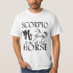 Dynamic black and white design, Scorpio horoscope symbol, horse in motion, for Scorpios born in the Year of the Horse. The Horse rules every twelve years; Horse years include 1918, 1930, 1942, 1954, 1966, 1978, 1990, 2002 and 2014. Horse people are active, imaginative, romantic and charismatic. Scorpio Horses are passionate, complex thinkers and achievers. They dislike routines and frivolous protocol, and can be rebellious if pressured. They may be inclined towards writing and literary arts, and tend to be well-read or knowledgeable about a great variety of subjects.