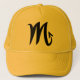 Scorpio zodiac sign hat, black scorpio logo on yellow gold hat, an original horoscope design created for sun sign Scorpio the Scorpion. Happy blessings from Happy Wishing Well dot com.