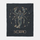Custom fleece blanket featuring Scorpio zodiac sign constellation with "Scorpio" in mystical typography with dark blue background.