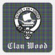 Scottish Clan Wood crest badge on clan tartan plaid pattern background. White Old English style customisable text.