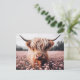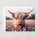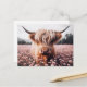 A postcard featuring a cute highland cow standing in a field of blush pink flowers.