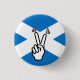 An indy button badge for supporters of Scottish independence who want nuclear weapons out of Scotland. Trident costs billions to maintain. The majority of people in Scotland would rather spend money on education and health. Only a Yes vote in September's referendum can deliver. The design is a black and white illustration of the two finger peace sign with a butterfly illustration on each of the raised fingers. In the background is a blue and white graphic of the Scottish flag, also knows as the Saltire or St Andrews Cross.